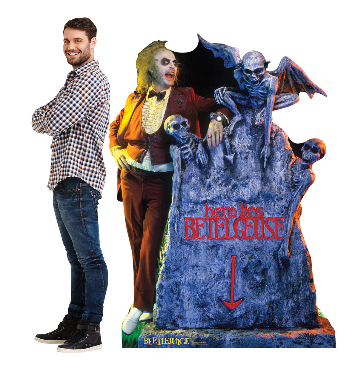 Your favorite bio-exorcist is never far away when you add this Here Lies Betelgeuse (Beetlejuice) Standee to your media room, office, dorm, and more. Just say his name three times and Beetlejuice will be here to exorcise those pesky humans from your home. No matter where you place it, this lifesize cardboard standup of Here Lies Betelgeuse (Beetlejuice) Standee measures at 63" x 46" and comes with an easel back for support to make it free standing. It also folds down for storage.