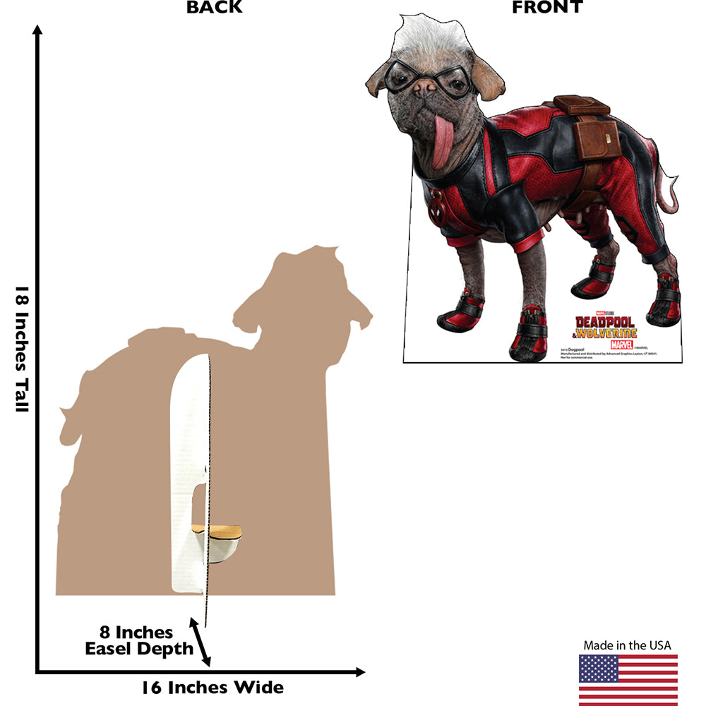 This is a cardboard cutout of Dogpool from the new Marvel movie Deadpool & Wolverine. Easy to set up, it features a single-sided, high-quality print on cardboard with an easel on the back so that it can stand on its own. Cardboard stand-ups make great decor for parties, photo ops, and events. Order yours today!