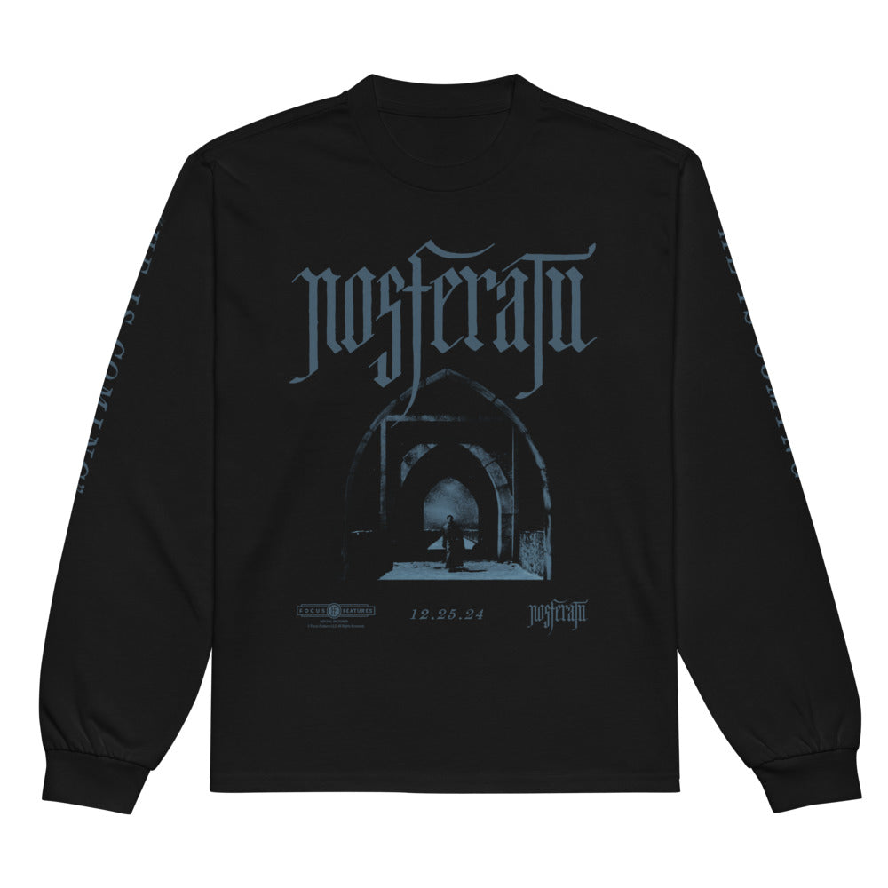 This Nosferatu He Is Coming Long Sleeve T-Shirt features the ominous quote in official film font alongside an image of the inside of Orlok's castle grounds from the film.