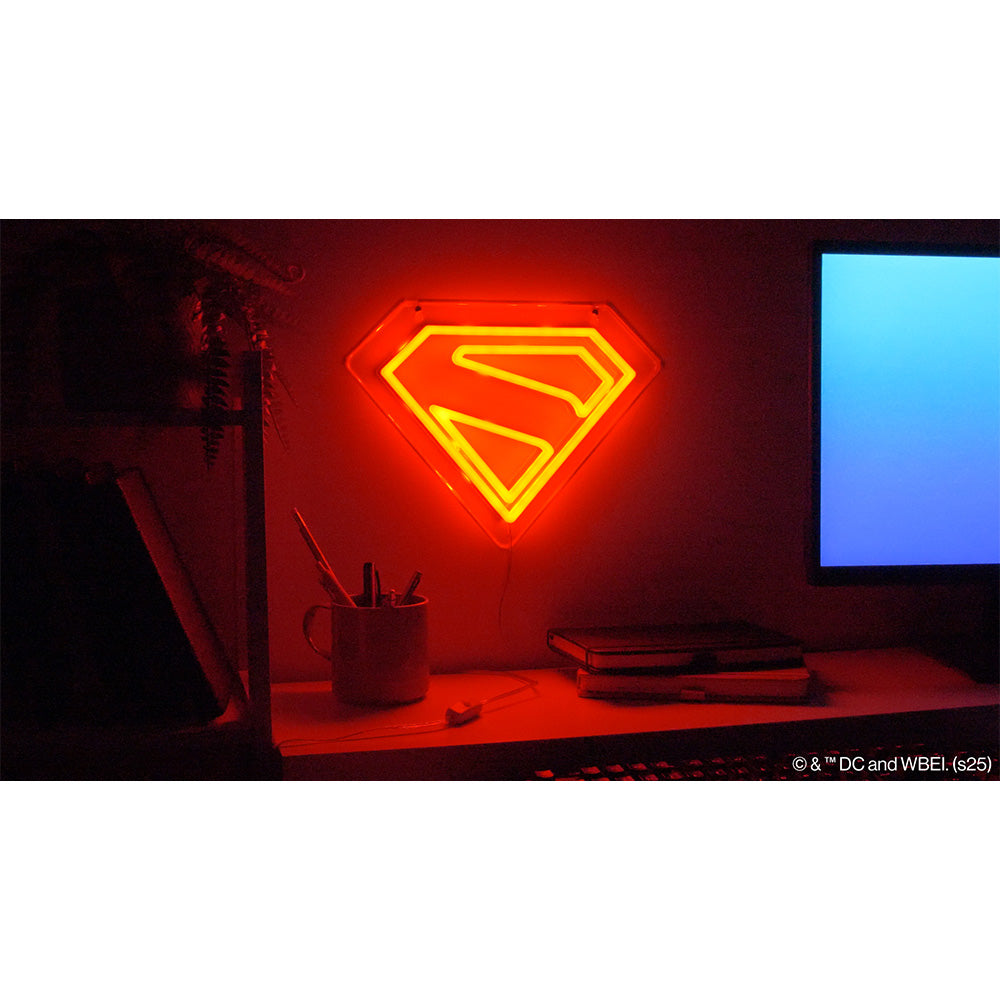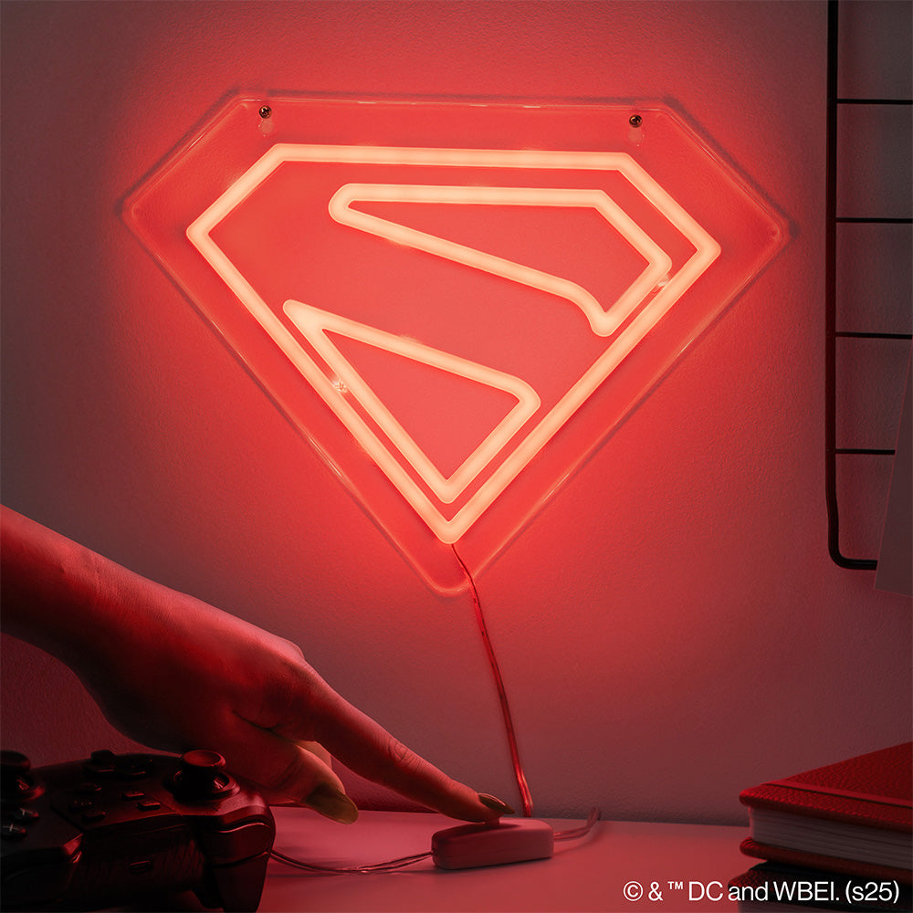 Invite some superhero flair into your home with this Superman LED Neon Light. The 24cm (9.45") tall wall-mountable light is shaped like the legendary Superman S-Shield logo. With a striking red glow, it will add a powerful touch to your space and is sure to steal the spotlight in any room. Power your light with the attached USB cable. The Superman LED Neon Light will bring a piece of the DC universe into your home.